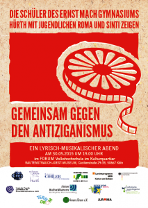 Gemeinsam mit Schülern des Ernst-Mach-Gymnasiums Hürth veranstaltet die djoNRW Gruppe Terno Drom am Samstag, den 30. Mai 2015, einen lyrischen Abend mit Musik und Tatsachenberichten von jungen Roma und Sinti. Dazu ist jeder ab 19.00 Uhr ins Rautenstrauch-Joest-Museum in Köln (Cäcilienstraße 29-33, 50667 Köln) herzlich eingeladen. Der Eintritt ist frei!