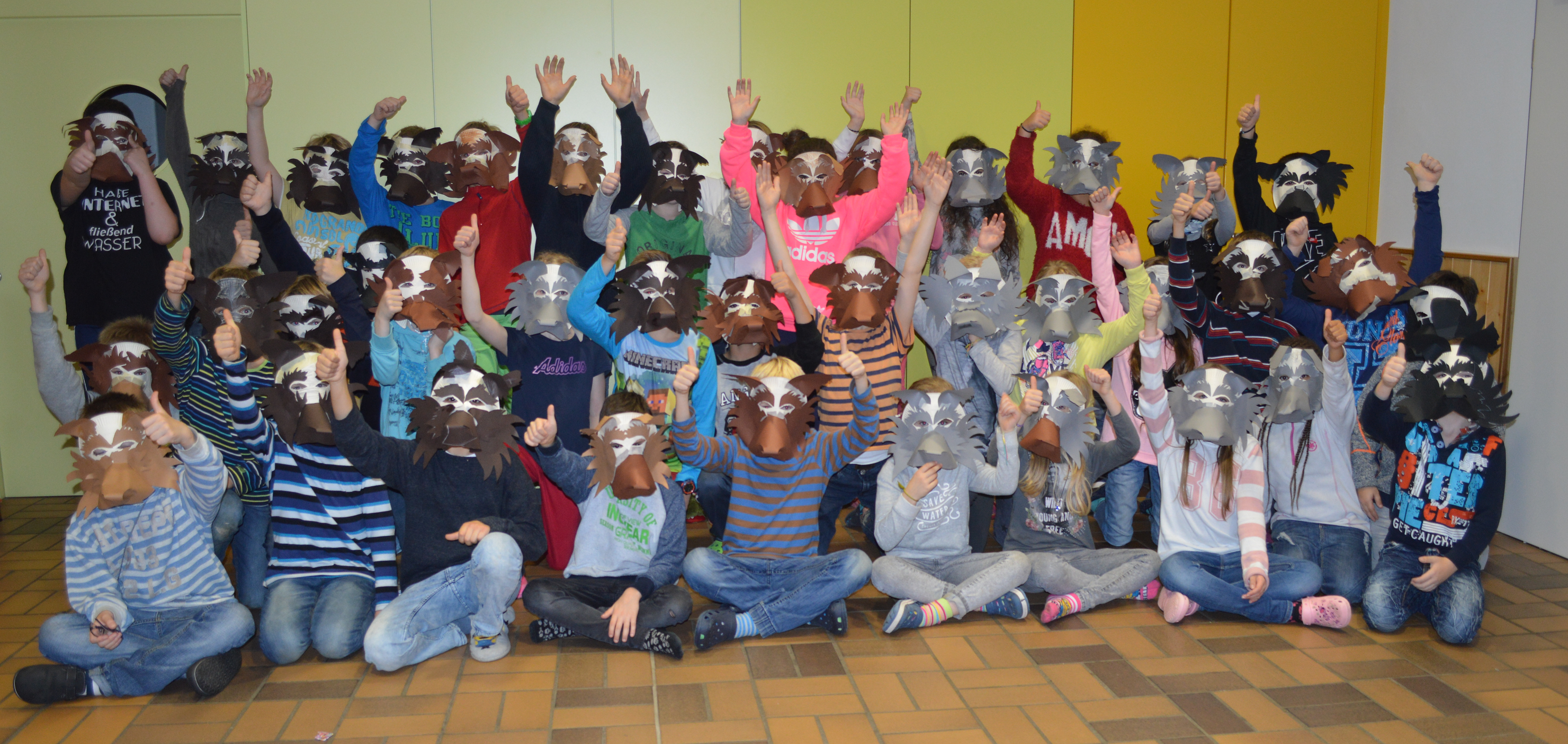 Für die kleinen Wölfe gab es viel zu lernen: Warum haben Wölfe unterschiedliche Fellfarben? Welche Zähne haben Wölfe, die wir Menschen nicht haben? Wieviel Kilogramm Fleisch frisst ein ausgewachsener Wolf pro Tag? Dies waren nur einige von vielen spannenden Fakten, die es zu enträtseln galt. Abgerundet wurden die kurzweiligen Lerneinheiten von jeder Menge Spiele, dem Basteln von sehr eindrucksvollen Wolfsmasken und einem Wettbewerb zur Kür des Alpharudels. Den Höhepunkt des Aufenthaltes bildete der Besuch im Tierpark Sababurg in Hofgeismar, bei dem unter anderem ein Rudel echter Wölfe beobachtet werden konnte.