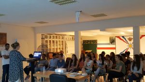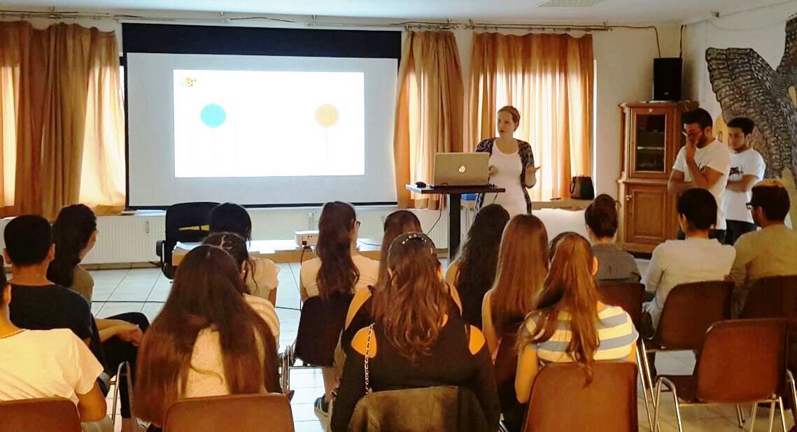 Während das Projekt von der Projektleiterin Nora Liebetreu vorgestellt wurde, unterstützen Georg Aho und Tanja Ergün die Präsentation ehrenamtlich. Georg engagiert sich bereits seit dem Projektstart im Dezember 2015 für das Projekt B’shayno.Willkommen. und Tanja ist wenig später, durch andere Jugendliche und die B’shayno-Facebook-Seite aufmerksam geworden, dazugekommen. „Ich hatte irgendwann von anderen Jugendlichen in Gütersloh mitbekommen, dass es das Projekt gibt. Dann habe ich mir die Facebook-Seite angesehen – ja und irgendwann habe ich dann einfach mit der Projektleiterin Nora Liebetreu telefoniert. Ich habe mich informiert und seitdem bin ich aktiv dabei“, erzählt Tanja. Ihre ehrenamtlichen Erfahrungen nutzen Georg und Tanja, um den interessierten Jugendlichen und jungen Geflüchteten zu zeigen, wie man bei B’shayno.Willkommen. mitmachen kann. Bei der Projektvorstellung in Gütersloh berichteten sie den Gästen, was sie alles schon mit B’shayno.Willkommen. unternommen haben. „Besonders Spaß haben mir das Minigolfspielen und der Bowling-Besuch gemacht. Das sind aber nur zwei Beispiele was alles mit B’shayno.Willkommen. möglich ist“, berichtet Georg Aho.