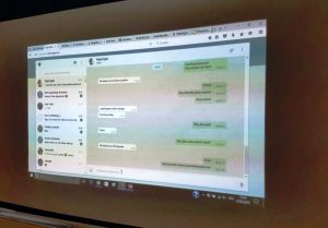 Im Anschluss an die Projektvorstellung stellten Tanja und Georg szenisch dar, wie der Weg von einer Freizeit-Idee bis zur Umsetzung mit B’shayno.Willkommen. verläuft. Exemplarisch diskutierten sie vor den Gästen die Idee ins Kino zu gehen. Um der Realität treu zu bleiben, schnappte Tanja sich ihr Handy und schrieb die Projektleiterin Nora Liebetreu per Live-Chat bei Whatsapp an. Anhand des Whatsapp-Gesprächs, das per Beamer auf eine Leinwand übertragen wurde, stellte Tanja die Idee vor. Nach einigen Rückfragen der Projektleiterin zu Organisation, Kosten und den Teilnehmenden konnte Nora Liebetreu den Kino-Besuch online genehmigen. „Die Whatsapp-Darstellung veranschaulicht den Jugendlichen, wie B’shayno.Willkommen. funktioniert. Es reicht manchmal einfach nicht zu sagen, dass die Möglichkeit besteht bei etwas mitzumachen. Die Jugendlichen brauchen handfeste Vorgehensweisen, um das Projekt und die damit verbundenen Strukturen zu verstehen und so auch wirklich partizipieren zu können“, beschreibt Nora Liebetreu und ergänzt: „Der Whatsapp-Chat bietet sich zur Veranschaulichung besonders dadurch an, dass den Jugendlichen klar wird, dass der Zugang und das Mitmachen total einfach – aber an ein paar Regeln – geknüpft ist“.