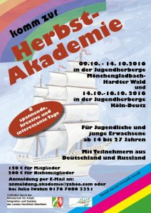 Das Camp ist jetzt vorbei, Alf ist lange schon wieder auf seinem Heimatplaneten, doch der JSDR e. V. hat einiges zu feiern: In diesem Jahr fand die erste Herbstakademie statt. Vom 9. bis zum 16. Oktober waren Jugendliche und junge Erwachsene im Alter von 14 bis 27 Jahren eingeladen sich kreativ gegen Vorurteile stark zu machen. Die Akademie fand in Zusammenarbeit mit dem JSDR NRW e. V. statt. Wir sind froh in diesem Jahr zum ersten Mal ein Angebot in dem Herbstferien zu machen. Damit erfüllt sich ein großer Wunsch vieler Teilnehmer des Sommercamps, die nicht wieder ein Jahr warten wollten, bis sie gemeinsam kreativ sein können. Für uns wieder ein Grund zum Feiern!