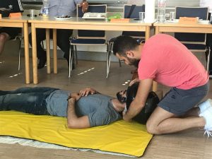 Unter den Teilnehmerinnen und Teilnehmern waren erneut viele junge Geflüchtete. Maya Yoken, die das Projekt „Jugendverbandsarbeit mit jungen Geflüchteten“ leitet, war von der Planung und Durchführung des Angebots begeistert: „Der Erste-Hilfe-Kurs ist die erste landesweite Maßnahme für djoNRW-Mitglieder, welche vor Ort von einem jungen Mann mit Fluchthintergrund selbstständig organisatorisch begleitet wurde. Youssef Hanna, Vorstandsmitglied des Landesverbandes des AJM, bereitete den Erste-Hilfe-Kurs in Paderborn vor, was mich sehr gefreut hat. Hier übernehmen junge Menschen mit Fluchthintergrund die Verantwortung für andere. Davon werden wir dieses Jahr noch mehr sehen.“ Ein ehrenamtlicher Mitarbeiter vom Jugendrotkreuz (JRK) bildete die teilnehmenden Jugendlichen mit großem Engagement und einer Art, die allen das Lernen Spaß machte, aus.